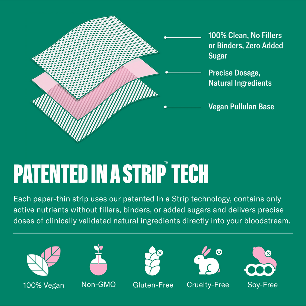 Each paper-thin NuStrip is created using our patented In a Strip™ technology and supercharged with the same amount of active nutrients as 2-3 pills or gummies.