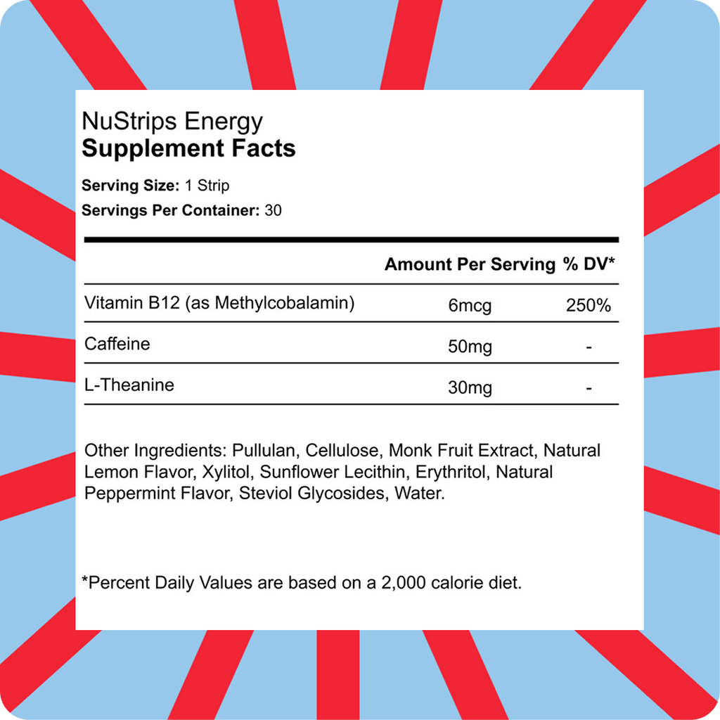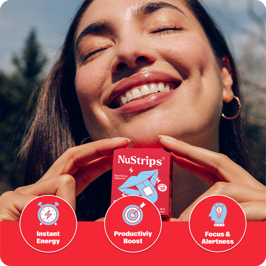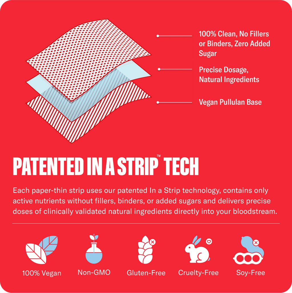 Each stamp-sized NuStrip is created using our patented In a Strip™ technology and supercharged with a precise dose of active ingredients to give you a lasting boost.