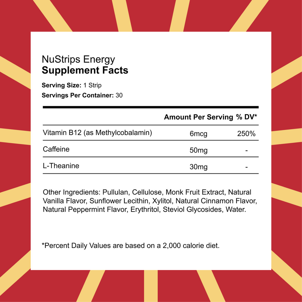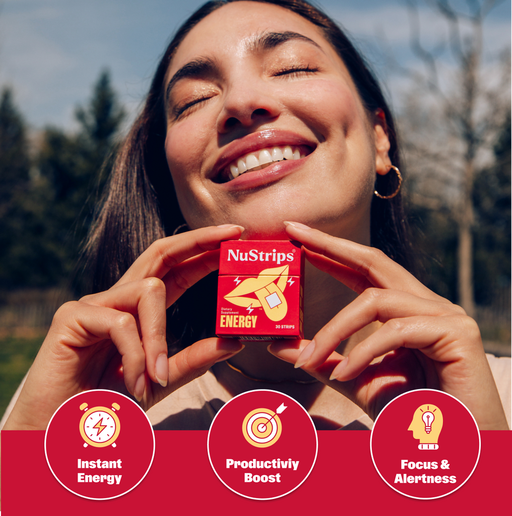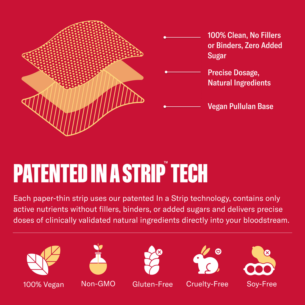 Each stamp-sized NuStrip is created using our patented In a Strip™ technology and supercharged with a precise dose of active ingredients to give you a lasting boost.
